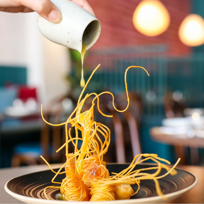 Deep fried marinated tiger prawns wrapped with egg noodles and server with homemade plum sauce