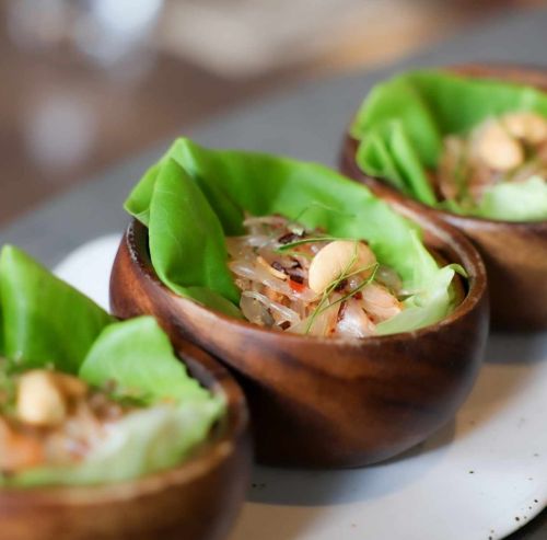 Pomelo fruit, fried shallots, coconut thread, cashew nut